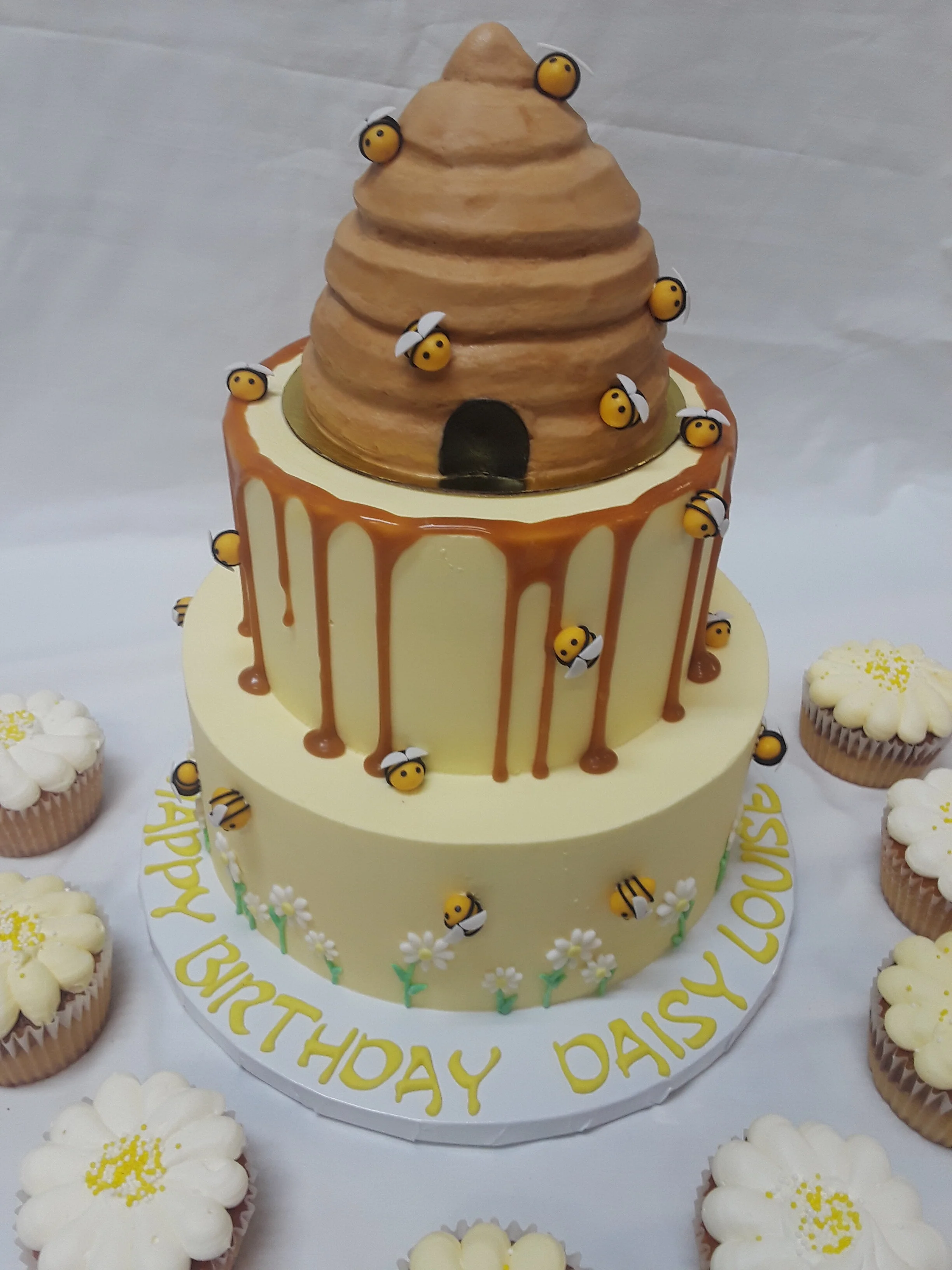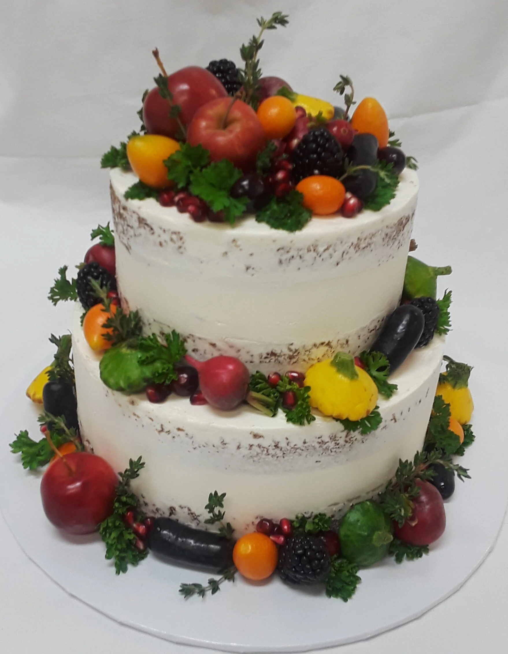 Three tiered, three layer naked creme brulee cake with Garrett CheeseCorn and CaramelCrisp Popcorn.